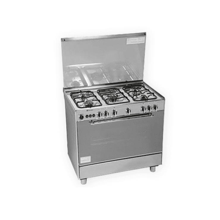 عدد الشعل 5، صمام امان، فرن مع الشواية، باب مقفل للفرن، مزود بالإضاءة والتوقيت، غطاء زجاجي علوي حراري، مروحة لتوزيع الهواء لا، استيل، الابعاد 90×60، الصناعة مصري.
